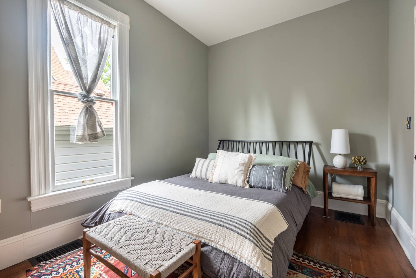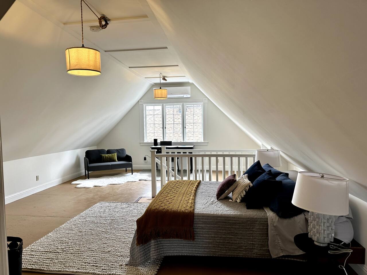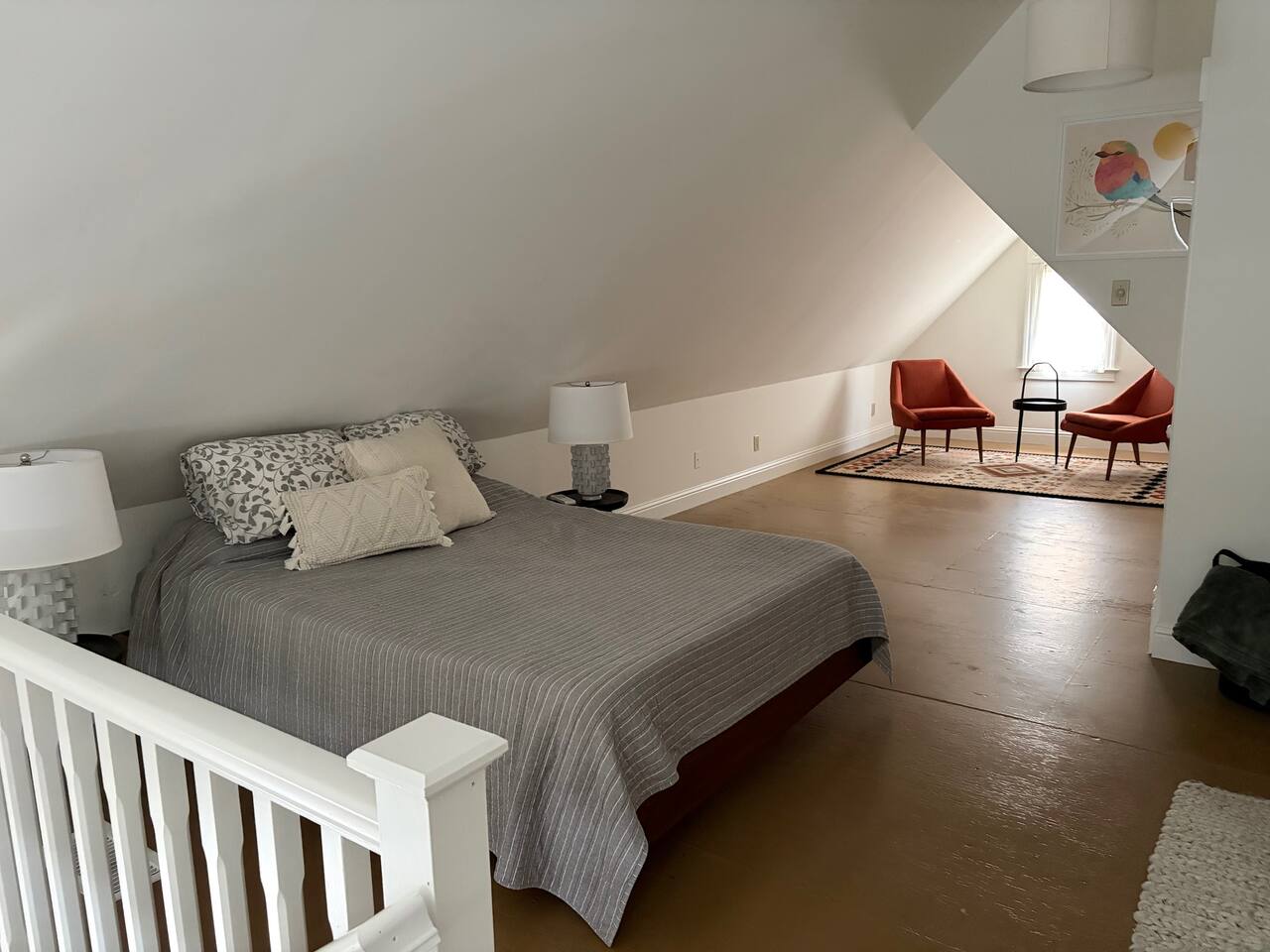This sweet 2br/1ba Queen-Anne cottage has such a lovely feel on this corner lot with charming garden. There are windows on all sides of the house so the light changes throughout the day. On the main floor you have a living room, dining room, bedroom, kitchen, bathroom (very small but adequate with clawfoot tub and shower assembly) and laundry room. Upstairs is a large finished attic that is used as a bedroom with an office and lounge area.