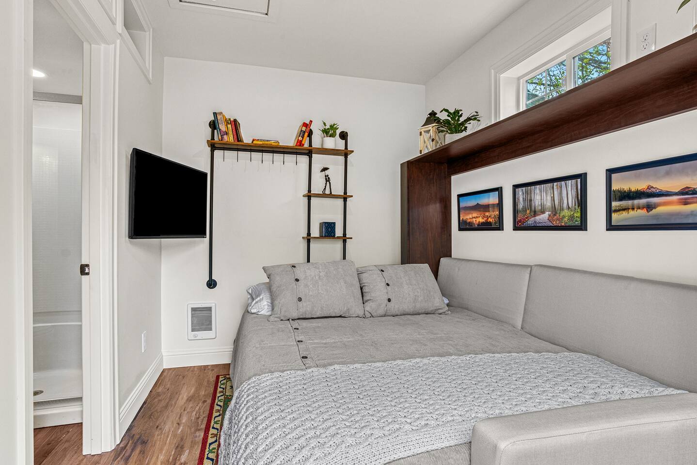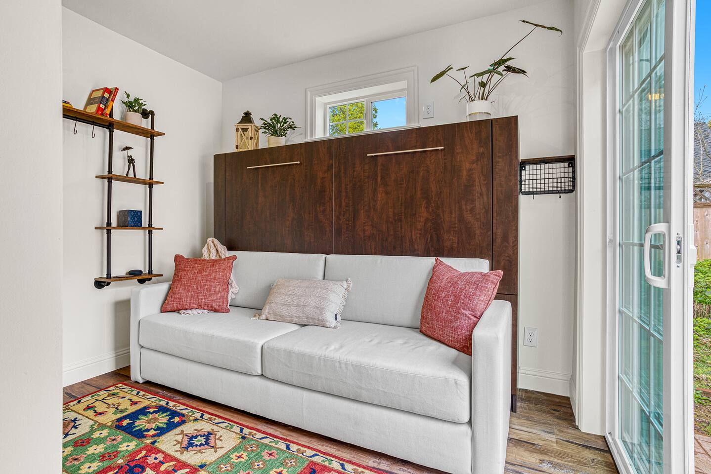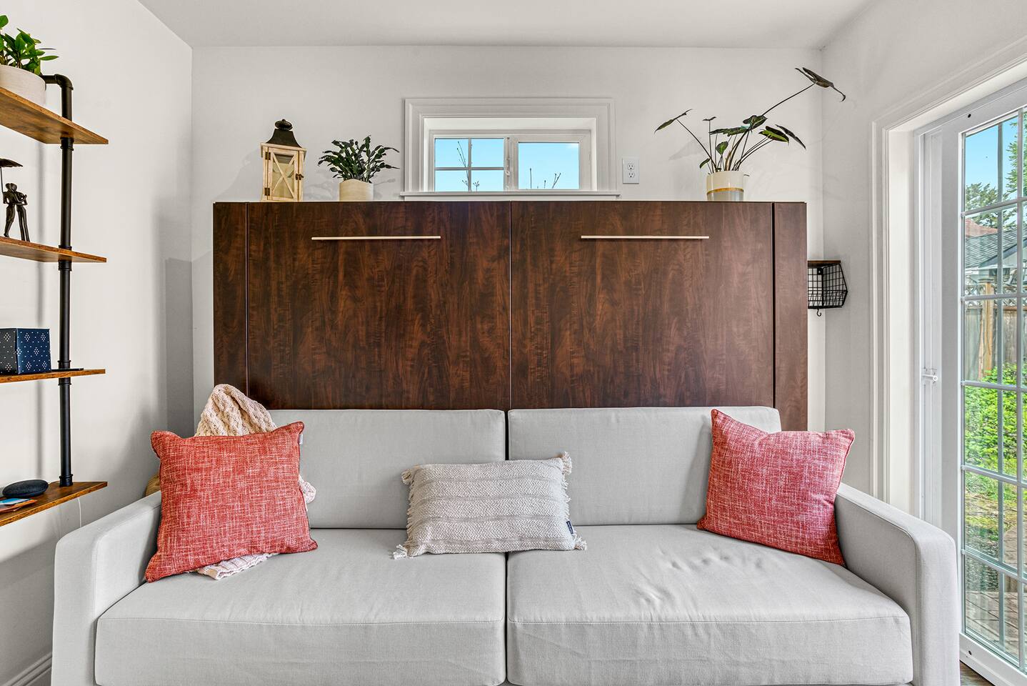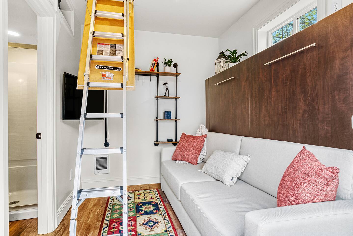 The couch doubles as a queen-size Murphy bed, designed to maximize space in our cozy studio. All pillows are removable—the bottom pillows are stored on the side of the couch, while the back pillows can be tucked behind the bed when folded down (see pictures). You'll find blankets in the basket on the wall next to the couch, with extra pillows and blankets stored in the living area nooks and in the loft, which can be accessed via the pull-down ladder in the living/bedroom space."
